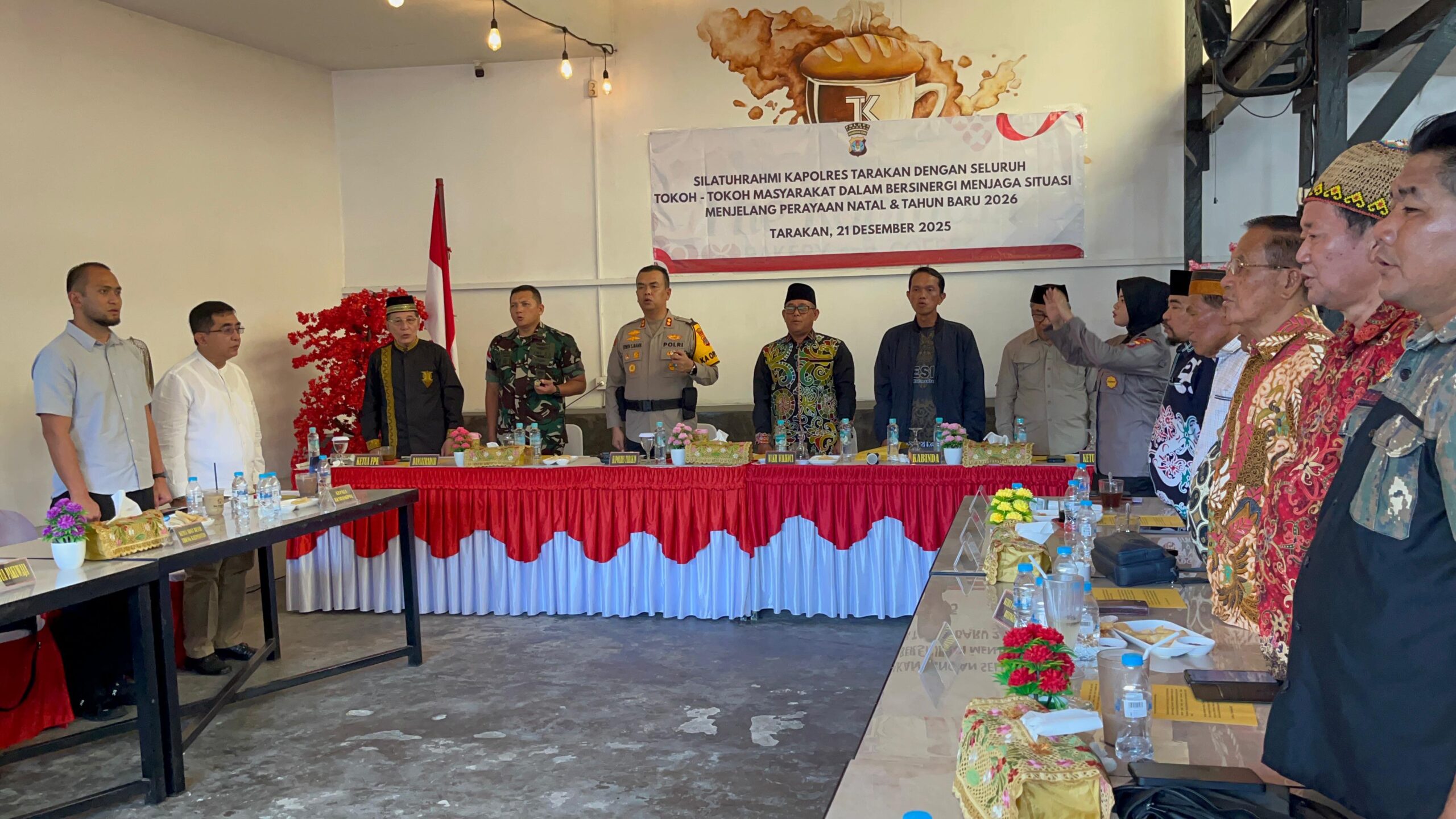 TARAKAN (Qiblatku) – Dalam rangka mempererat sinergi dan menjaga kondusivitas keamanan menjelang perayaan Natal dan Tahun Baru 2026, Kapolres Tarakan Erwin S. Manik, S.H., S.I.K., M.H., melaksanakan kegiatan silaturahmi bersama seluruh tokoh masyarakat Kota Tarakan. Kegiatan tersebut dilaksanakan pada Minggu, 21 Desember 2025, pukul 13.00 Wita hingga selesai, bertempat di Cafe The Kopitiam Tarakan, Jalan Slamet Riady, Kelurahan Karang Anyar, Kecamatan Tarakan Barat.