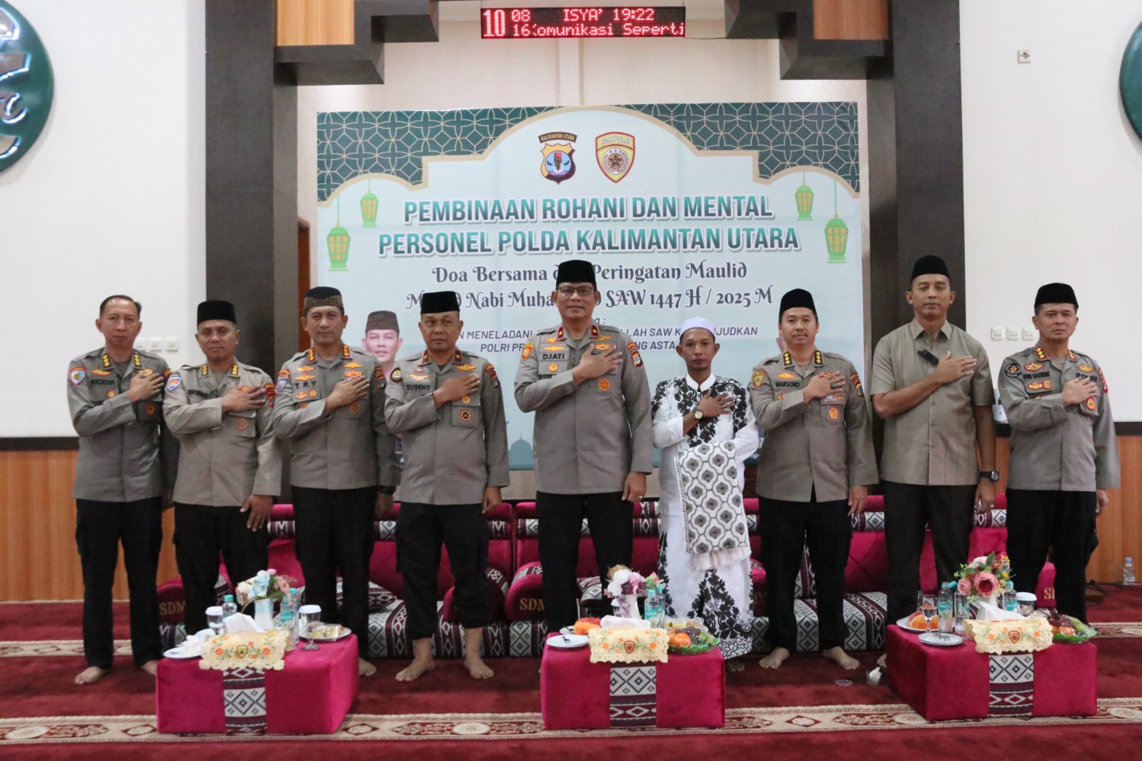 TANJUNG SELOR (Qiblatku) – Kepolisian Daerah Kalimantan Utara (Polda Kaltara) menggelar kegiatan Pembinaan Rohani dan Mental (Binrohtal) serta doa bersama Dalam rangka memperingati Maulid Nabi Muhammad SAW 1447 Hijriah di Masjid Aryaguna Polda Kaltara, Kamis (11/9).