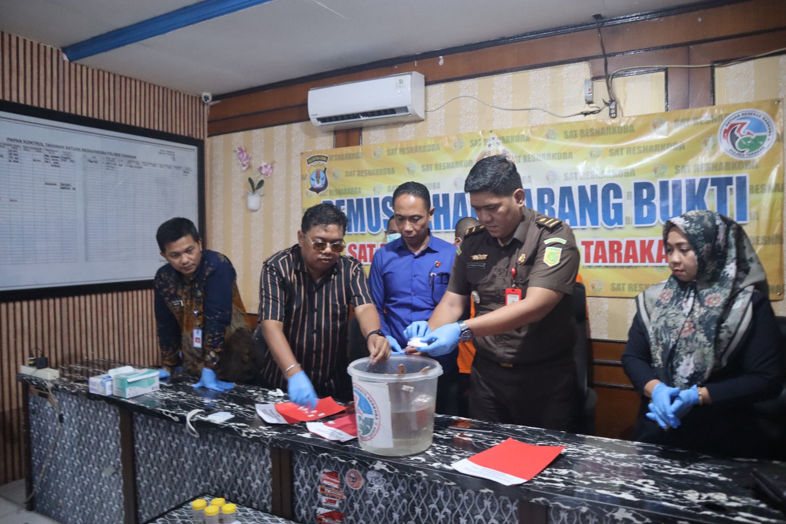Hadir dalam kegiatan pemusnahan tersebut, perwakilan dari pengadilan Negeri Tarakan, perwakilan dari kejaksaan negeri tarakan, perwakilan dari BNN Kota tarakan serta perwakilan dari labkesda kota tarakan, Pemusnahan barang bukti narkoba jenis sdabu-sabu dipimpin oleh KBO Sat Reskoba Polres Tarakan IPTU Amiruddin Huzain. Barang bukti tersebut disita dari tersangka berinisial “AS”,”AM”,”NS”, yang berhasil ditangkap dalam operasi penindakan aktif yang dilakukan oleh personel sat reskoba polres tarakan.